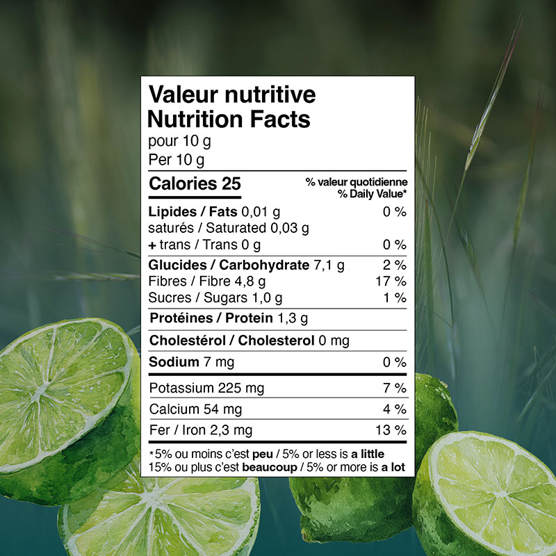 Herbe de blé, Herbe d'orge, Luzerne, Orge commune, Herbe d'avoine, Racine séchée de pissenlit, Saveur naturelle de lime |