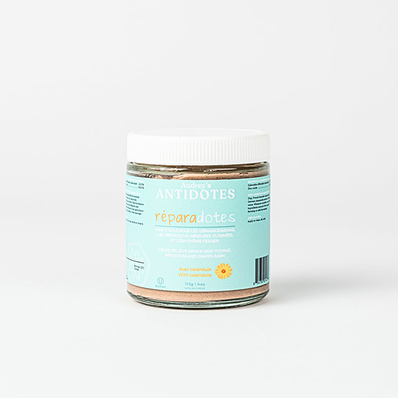 | Ingrédients | Médicinaux : Calendula officinalis (Calendula) - 2,0 %, Zinc oxide (Oxyde de zinc) - 10,0 % Non-médicinaux : Argile, Huile essentielle de lavande française, Extrait de camomille allemande, Eau purifiée |
